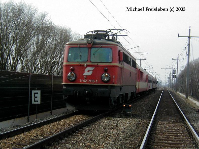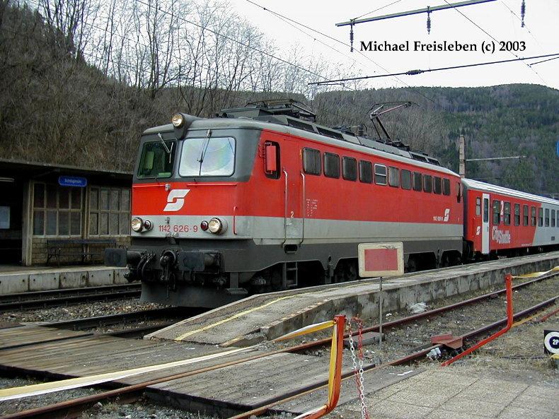 1142 626-9 mit einem Regionalzug in der Haltestelle Schlöglmühl am 03.März 2003