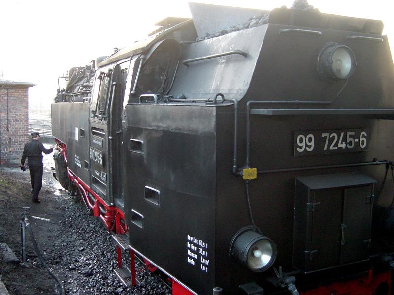 99 7245-6 beim Wasserfassen in Wernigerode, 22. Februar 2003