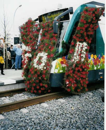 Am 07. April 2001 durchfährt Combino Tw. 412 des Verkehrsbetriebs in Potsdam (ViP) den Teppich aus Blüten und eröffnet somit den sogenannten "Buga-Nordast".