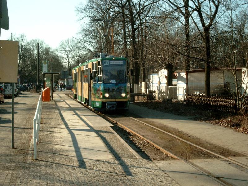 Nach dem die Kt4Dm 124 u. 224 gerade die Nuthe-Schnellstraße unterfahren haben, erreichen sie den Abzw. "Am Stern" und etwas später auch die Haltestelle "Gaußstraße". Der Abzweig im Vordergrund wird seit 2002 wieder regelmäßig durch die verkürzte Linie X98 genutzt.