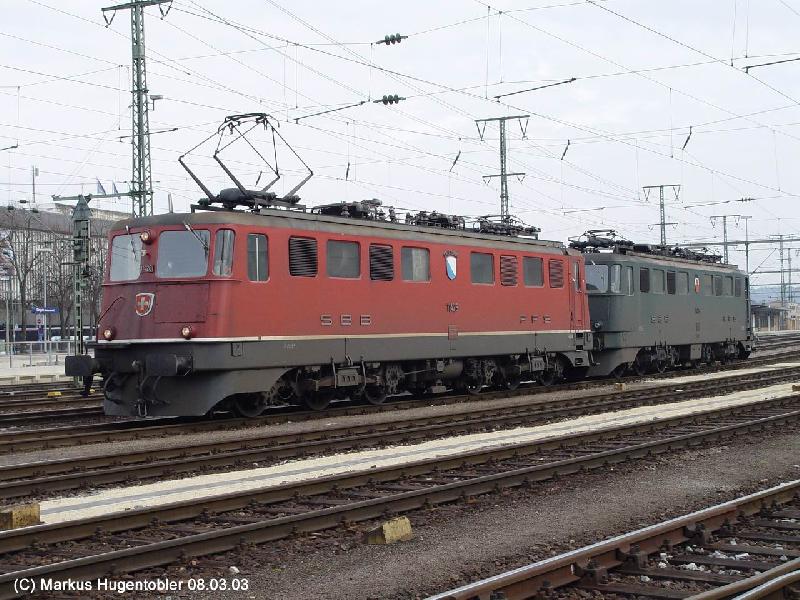SBB Cargo Ae 610 (Ae 6/6) 11426 (Stadt Zürich)in Rot und eine Grüne Schwesterlok am 08.03.03 in Singen (Htw)
