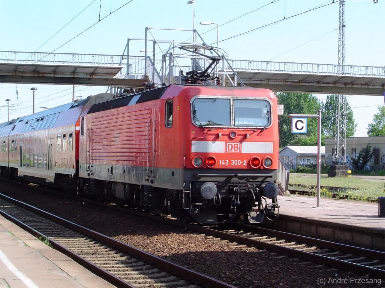 BR143 300 bei der Ausfahrt aus dem Hbf Greifswald am 28.05.03.