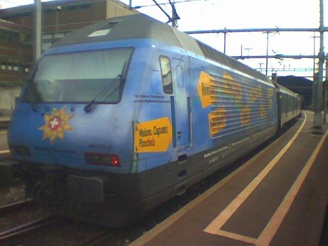 Die Werbelok Re 460 084-7, mit der Werbeaufschrift Rentenanstalt, steht am 12.10.03 im Bahnhof Zürich.