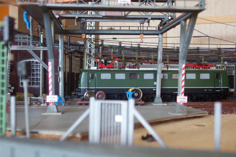 Harzbahn April 2004: 103er vor der Schlosserei. Die Sommerfeld-Spinne wird von den Abspannmasten vor den Schuppentoren auf starken Zug gebracht.