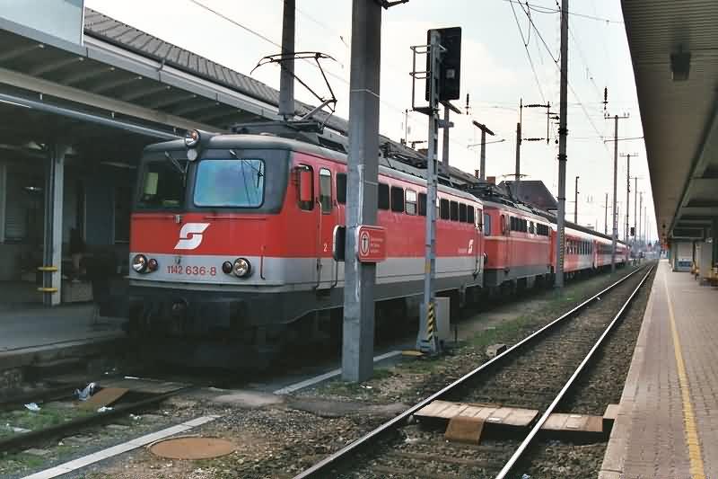 Zwei Eloks der Reihe 1142 vor einem Regionalzug nach Linz im Bahnhof Attnang Puchheim am 28.3.2004