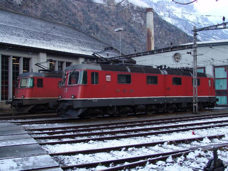 Eher etwas was man selten sieht, ist eine grüne Re 10/10. Hier die Re 6/6 11663 "Eglisau" mit einer Re 4/4 am 27.11.04 bei der Reussbrücke zwischen Rotkreuz und Oberrüti