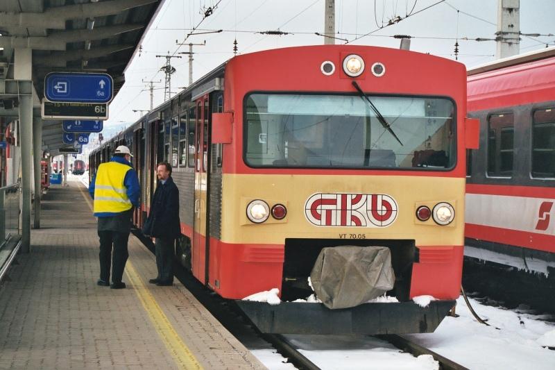 Dieselelektrischer Triebwagen VT70.05 der Graz-Köflacher-Bahn wartet in Graz Hbf. auf seine Abfahrt (März 2004)