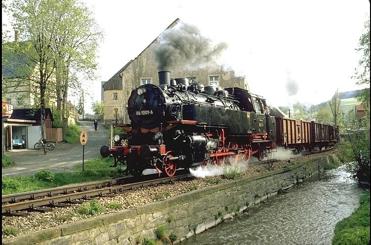 Deutsche Reichsbahn Mai 1983,Lok 86 1001-6 bei Walthersdorf,Strecke Schlettau-Crottendorf. (Archiv P.Walter)
