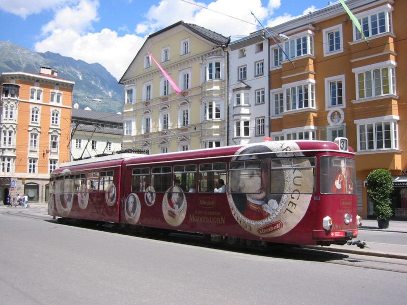 Eine Straßenbahn mit Werbung für Mozartkugel ist am 16.07.2004 In Innsbruck unterwegs.
