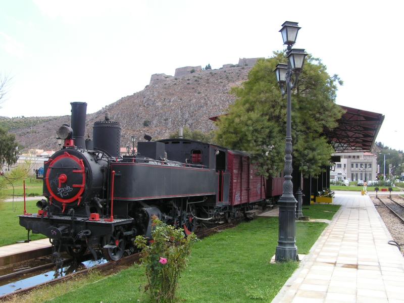 Griechenland,Peloponnes.Der Denkmal Zug von der anderen Seite,im Hintergrund die Festung Palamidi.Nafplio den 25.09.04