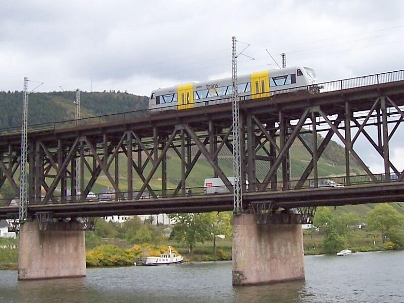 RegioShuttle der TransRegio-Bahn am 18.10.2004 auf der kombinierten Eisenbahn-Strassen-Brücke über die Mosel bei Bullay, Strecke Koblenz - Trier.