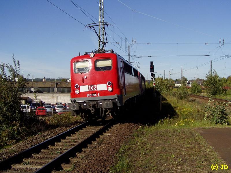 02.09.04: 140 115-7 rumpelt langsam mit ihrem Ganzzug aus leeren Eaos in den Bahnhof Angersdorf.