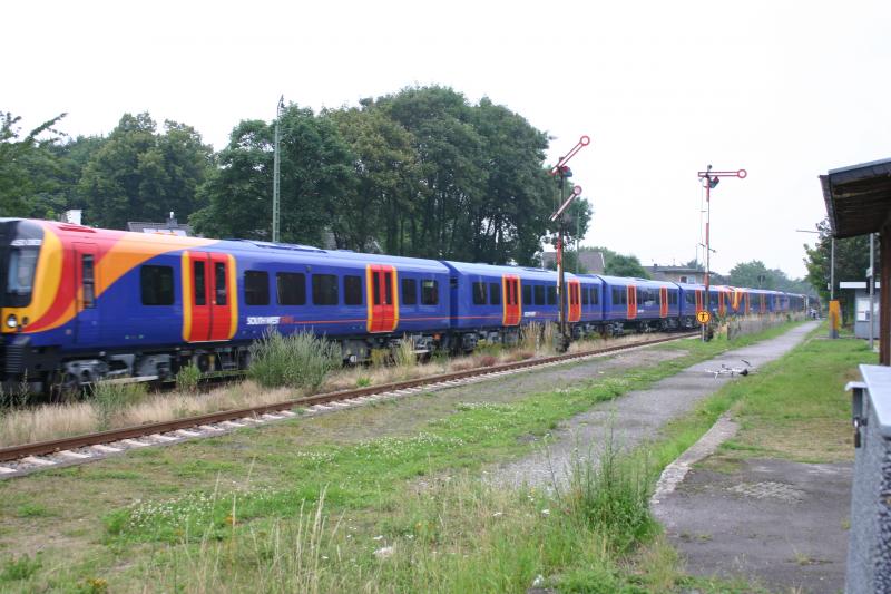 2 Triebzüge in Doppeltraktion (Baureihe ist mir unbekannt) der Southwest-Railways (GB) auf der Überführungsfahrt vom Siemens-Prüfcentrum-Wildenrath im Bahnhof Mönchengladbach-Rheindahlen (Deutschland)gezogen von einer MaK G1206