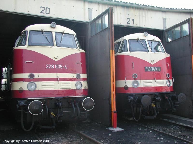 Aufgenommen im Bw Arnstadt am 2.5.2004 BR 228 505-4 und BR 118 749-1