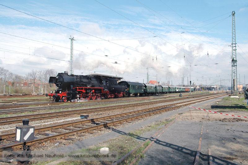 Durchfahrt eines dampfbespannten Sonderzuges durch den Bahnhof Roßlau (Elbe).