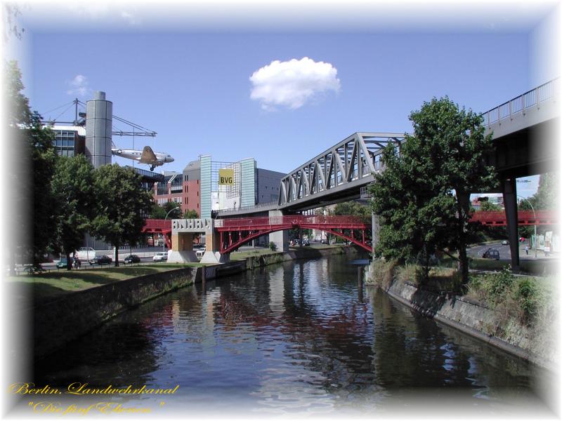 Berlin,Landwehrkanal  Die fünf Ebenen  (S.Grunack 1910) Vom gleichen Betrachtungsort des Malers aus, 93 Jahre später im Jahr 2003 fotografiert.Links im Bild ein  Rosinenbomber  Typ C-47 vor der neuen Halle Luft u.Raumfahrt(Eröffnung 2005)des DTB