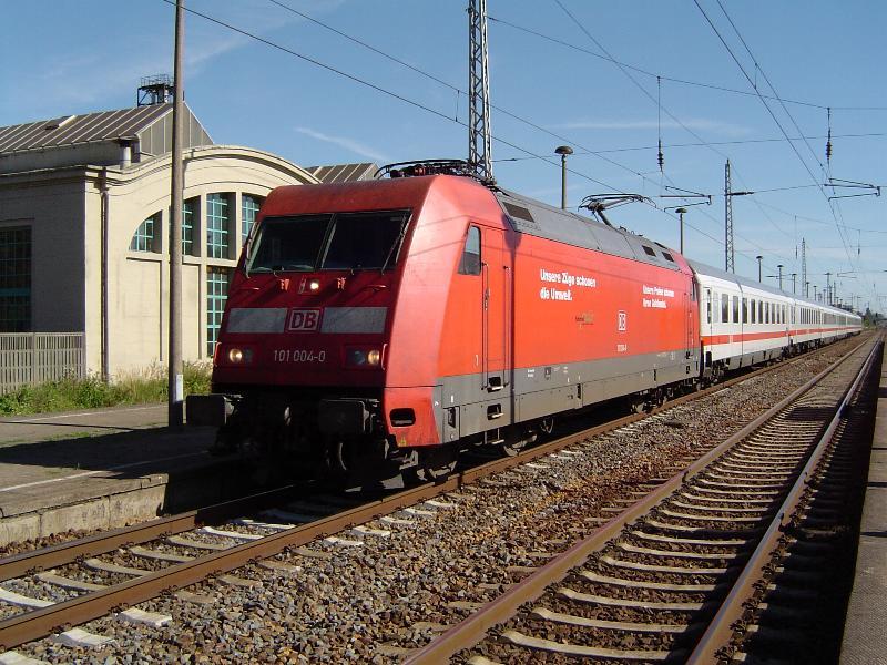 BR101 004-0 vor IC2455 "Pommersche Bucht" auf dem Weg von Düsseldorf über Berlin und Stralsund nach Binz. Das Foto entstand am 10.09.04 bei der Einfahrt in den Greifswalder Hbf.