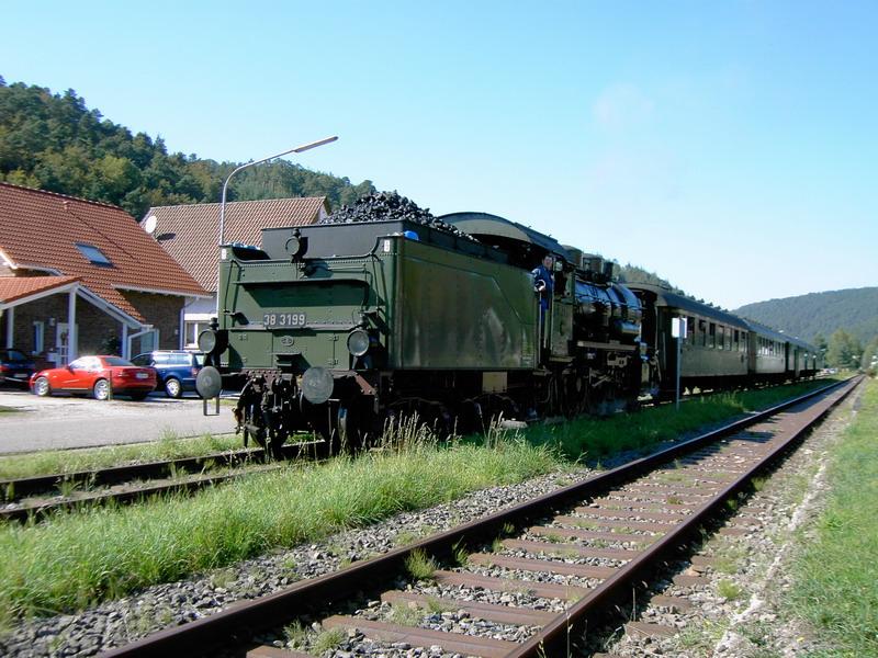 Die BR 38 31.99 bei der Einfahrt in den Bahnhof von Dahn mit einem Sonderzug am Haken