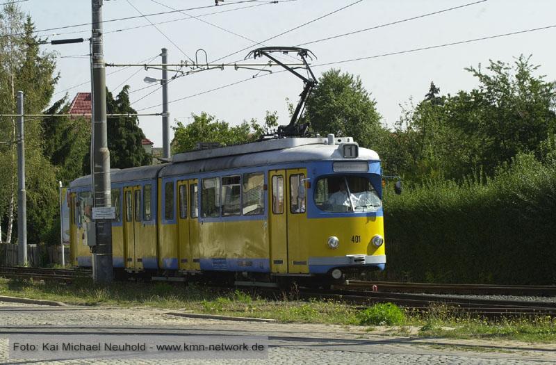 Ein Triebwagen der Gothaer Straßenbahn fährt als Linie 1 zum Kreiskrankenhaus. Das Foto entstand in Höhe der Haltestelle Wagenhalle in Gotha.