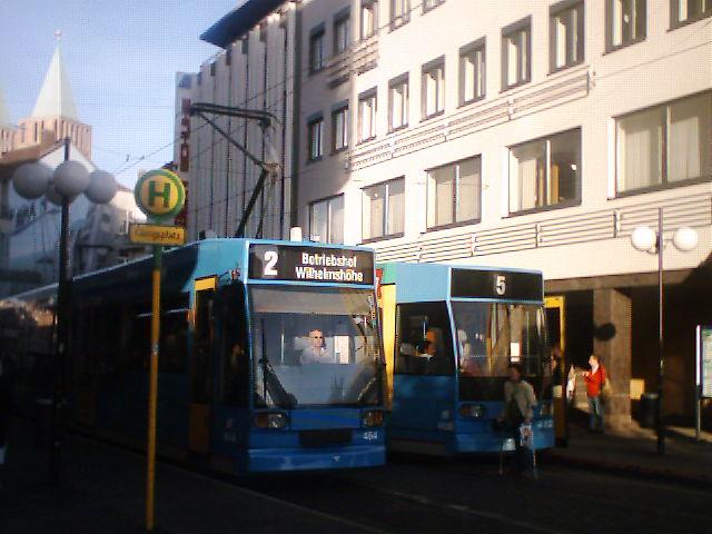 Im Vordergrund die Linie 2 auf dem Weg zum Betriebshof Wilhelmshöhe, im Hintergrund die Linie 5 zur Holländischen Straße.