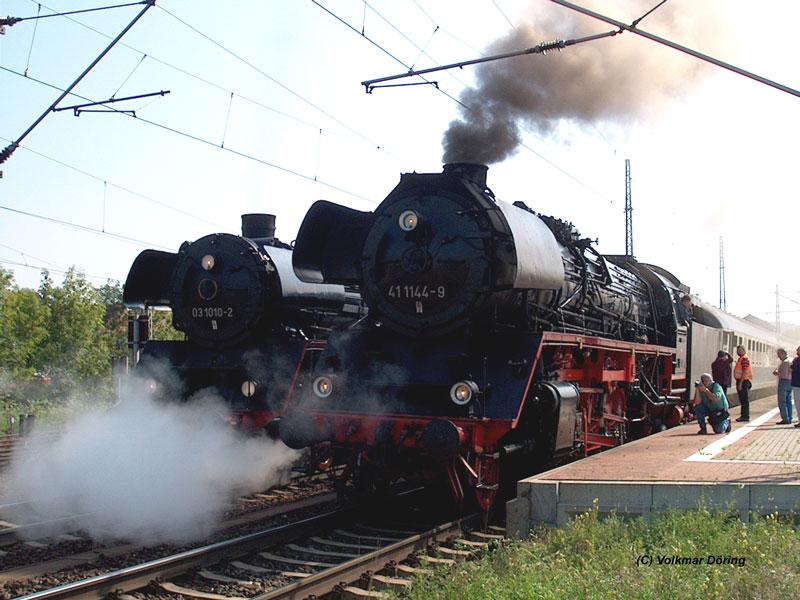 In Eisenach warten die 03 1010 mit dem Sonderzug aus Berlin und die 41 1144 mit dem EK-Sonderzug aus Hamburg auf Ausfahrt nach Meiningen- 04.09.2004