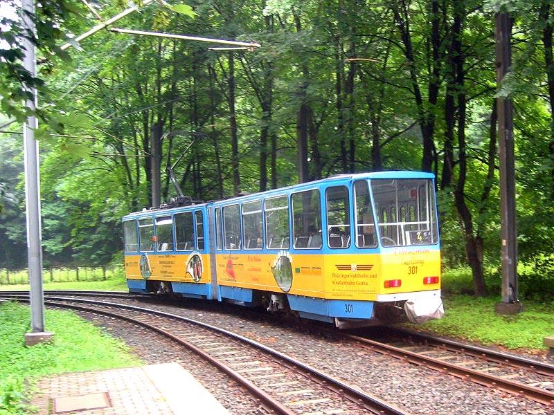 Triebwagen 301 der Thüringerwaldbahn beim Verlassen der Haltestelle Reinhardsbrunn Bahnhof am 24. Juli 2004.