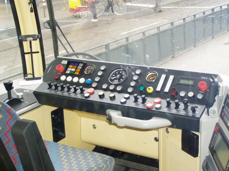 Fahrgastraum des Zweisystemwagens 914. Für die Sitze in der neuen Serie ab Wagen 900 wurden etwas weichere Stoffe verwendet und ist damit auch bequemer zu sitzen und nicht mehr so hart wie bisher. In der Mitte ist ein Panoramabteil mit Toilette. Mitte März 2005
