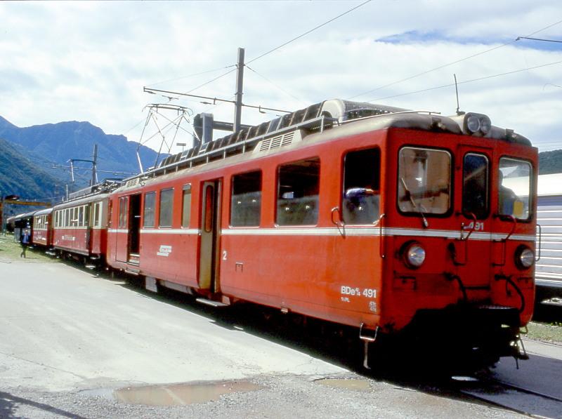 FM Extrazug 3207 für GRAUBÜNDEN TOURS Cama - Castione-Arbedo vom 29.08.1997 kurz vor Abfahrt in Cama mit Triebwagen BDe 4/4 491 - A² 1102. Hinweis: mit dieser Kompozusammenstellung ging es bis Grono.