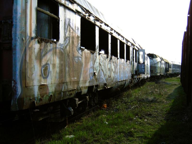 Einer der Unfallwagen des schweren Rangierunfalles im Eisenbahnmuseum (2002)wird gerade verschrottet