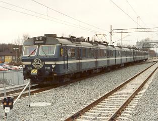 Storstockholms Lokaltrafiks X 10 3121 in Västerhaninge. Der Zug setzt seine Fahrt nach Nynäshamn fort. Das Bild entstand am 07.05.1997.