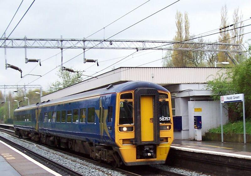 158 790 Central fährt am 21.04.2005 von Manchster Piccadilly nach Manchester Airport durch die Haltestelle Heald Green. Hier sieht man gut eine Besonderheit der britischen Eisenbahnen, sie haben bei Tag immer den rechten Scheinwerfer eingeschaltet.