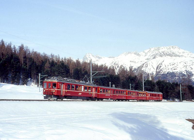 RhB PENDELZUG 313 von Samedan nach Pontresina am 03.03.1998 kurz vor Pontresina mit Triebwagen ABe 4/4 502 - B 2340 - B - AB 1514 - BDt 1723. Hinweis: 502er inzwischen Abbruch!