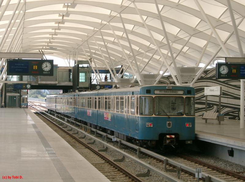 Bahnhof der Allianz-Arena in München: "Fröttmaning". Eine Dreifachtraktion von A-Wagen fährt gerade Richtung Innenstadt ab.