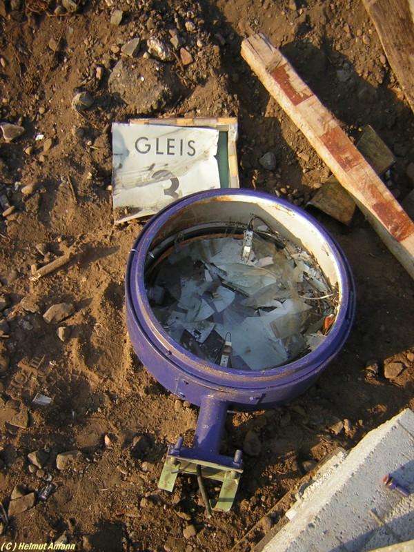 14.10.2005 eine zertrümmerte Bahnhofsuhr und eine Gleisnummerntafel.