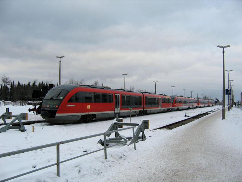 In Altenberg (Erzgebirge) warten die Wintersportsonderzüge 642 135 + 642 173 und 642 174 + 642 156 bis zur Rückfahrt nach Dresden - 10.12.2005