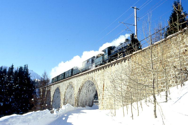 RhB DAMPFZUG für GRAUBÜNDEN TOURS 3723 von St.Moritz nach Scuol am 01.02.1998 auf Val Susauna-Viadukt mit Dampflok G 4/5 108 - B 2246 - D² 4052I - B² 2060 - B 2247.