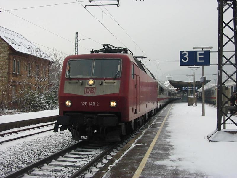 120-148 am 29.12.2005 mit einem leeren Ersatz bei Halt in Weinheim (Bergstraße) aber nur wegen eines Roten Signals.