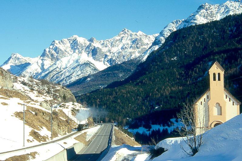 RhB DAMPFZUG 3768 von Scuol nach Samedan am 09.02.1997 kurz vor Ardez mit Dampf-Lok G 4/5 108 - B 2245 - A² 1102 - B² 2060 - D² 4052I. Hinweis: Blick auf Kapelle und das wunderschöne Unterengadin mit der Kapelle bei Ardez. Fast unsichtbar wurde die Bahnlinie in die Landschaft eingefügt. Bei einer üblichen Nahaufnahmem von gleicher Stelle sieht man leider nur wenig von der Landschaft.