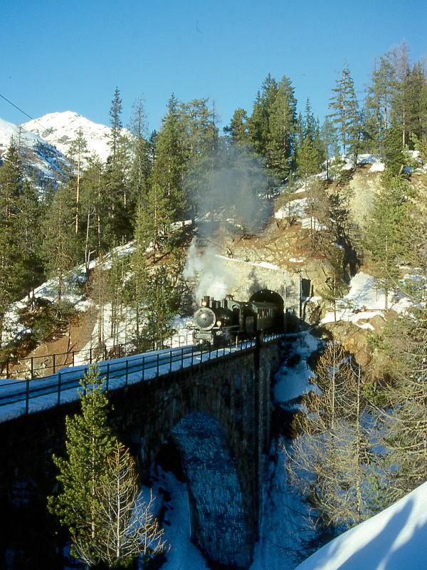 RhB DAMPFZUG 3768 von Scuol nach Samedan am 09.02.1997 auf Val Mela-Viadukt mit Dampf-Lok G 4/5 108 - B 2245 - A² 1102 - B² 2060 - D² 4052I. Hinweis: zu dieser Jahreszeit erreicht die Sonne nur ganz kurz den Viadukt am späten Nachmittag!