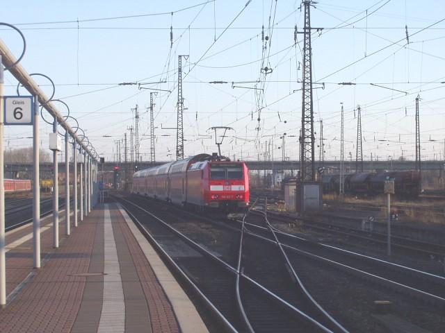 146 122 ist die momentan letzgelieferte Frankfurter 146. Mit einem RE nach Fulda verläßt sie am 5.2.2005 den Hanauer Hauptbahnhof.