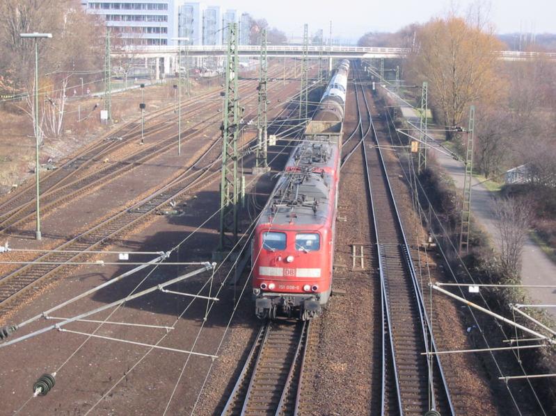 151 008 an der Spitze eines Güterzuges, der am 09.02.2005 durch Karlsruhe in Richtung Süden rollt.