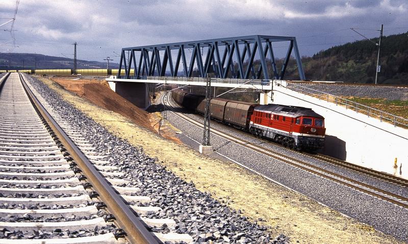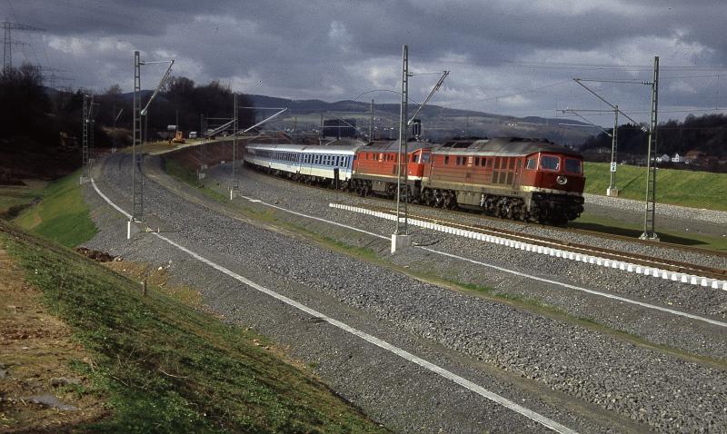 Noch ist sie nicht im Betrieb die Berliner Kurve Anfang der 90er Jahre, im Zuge des Lückenschlußes aber wird es ein Bild wie dieses wohl nicht mehr geben. Ein Interregio in Richtung Eisenach/Erfurt bespannt mit zwei ´232er.