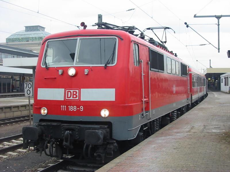 Hier sieht man die 111-188 die am 10.2.2004 als RE nach Frankfurt a. M. unterwegs war. Foto zeigt sie in Mannheim Hbf.