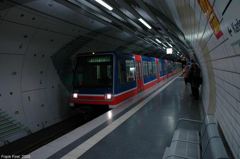 Stadtbahnwagen 5202 in der "London Docklands" Original Farben am Karlsplatz. 11. Februar 2005.