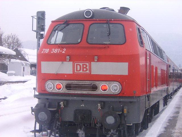 218 381 wartet mit einem RE in Oberstdorf am 17.02.2005 auf die Abfahrt
