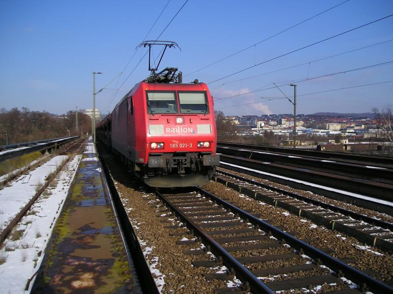 Stadtbahn- und S-Bahnverkehr im Bereich des Vaihinger Viaduktes. Im Vordergrund die doppelstöckige Talbrücke für Autos (unten), Fußgänger und Radfahrer (oben.) Das Bild ist aus zwei Fotos zusammengesetzt, Trennlinie Oberkante Bahnviadukt. 17.2.2005 (M)