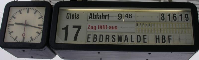 "Hampelmann" auf dem Bahnsteig in Eberswalde Hbf Ende 2003. Der alte Zugzielanzeiger soll funktionslos erhalten bleiben.