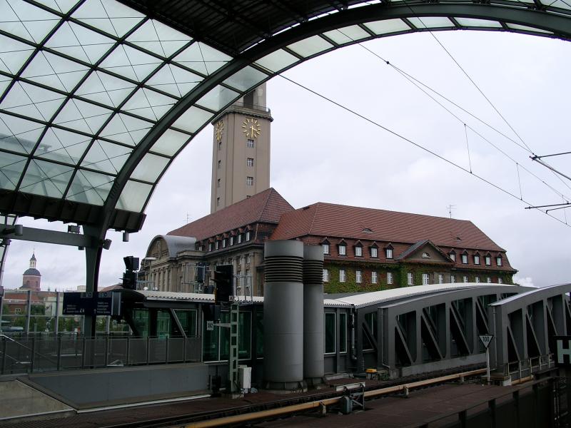 Bahnhof Berlin-Spandau mit Blick auf die Eisenbahnbrücke über die Klosterstraße und auf das Rathaus Spandau am 25.9.2004