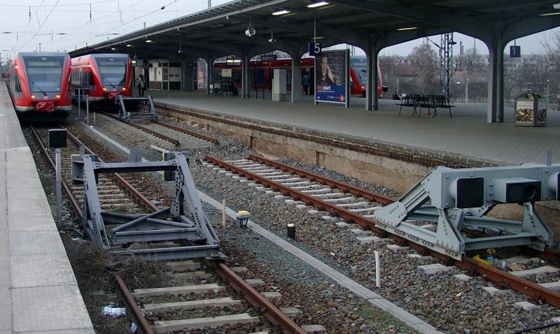 Bf Hennigsdorf (b. berlin): 3 Gleisabschlüsse an 2 Bahnsteigkanten sieht man selten. Hier sogar mit unterschiedlichen Bahnsteighöhen am selben Bahnsteig. S-Bahn und Regionalbahn halten an der gleichen Kante.