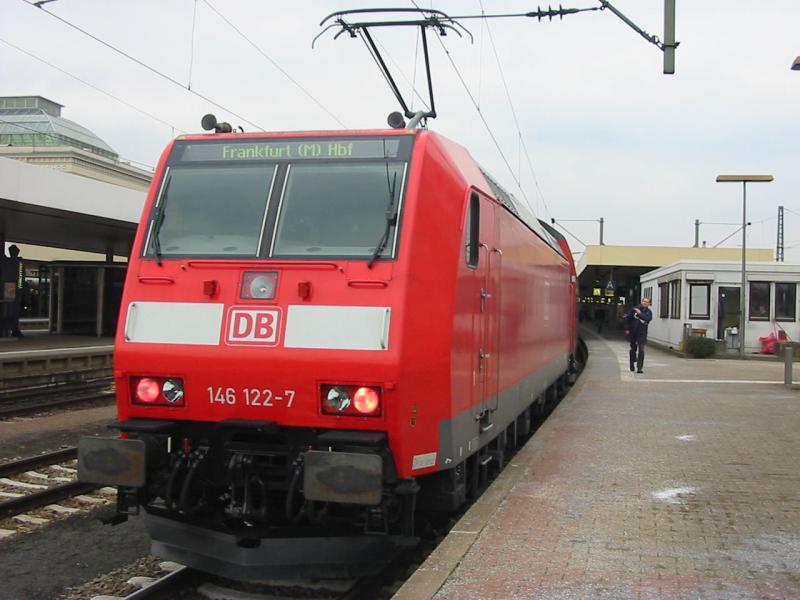 Hier sieht man die 146-122 die am 18.2.2005 einen RE nach Frankfurt a.M. zog. Hier ist sie noch in Mannheim Hbf.